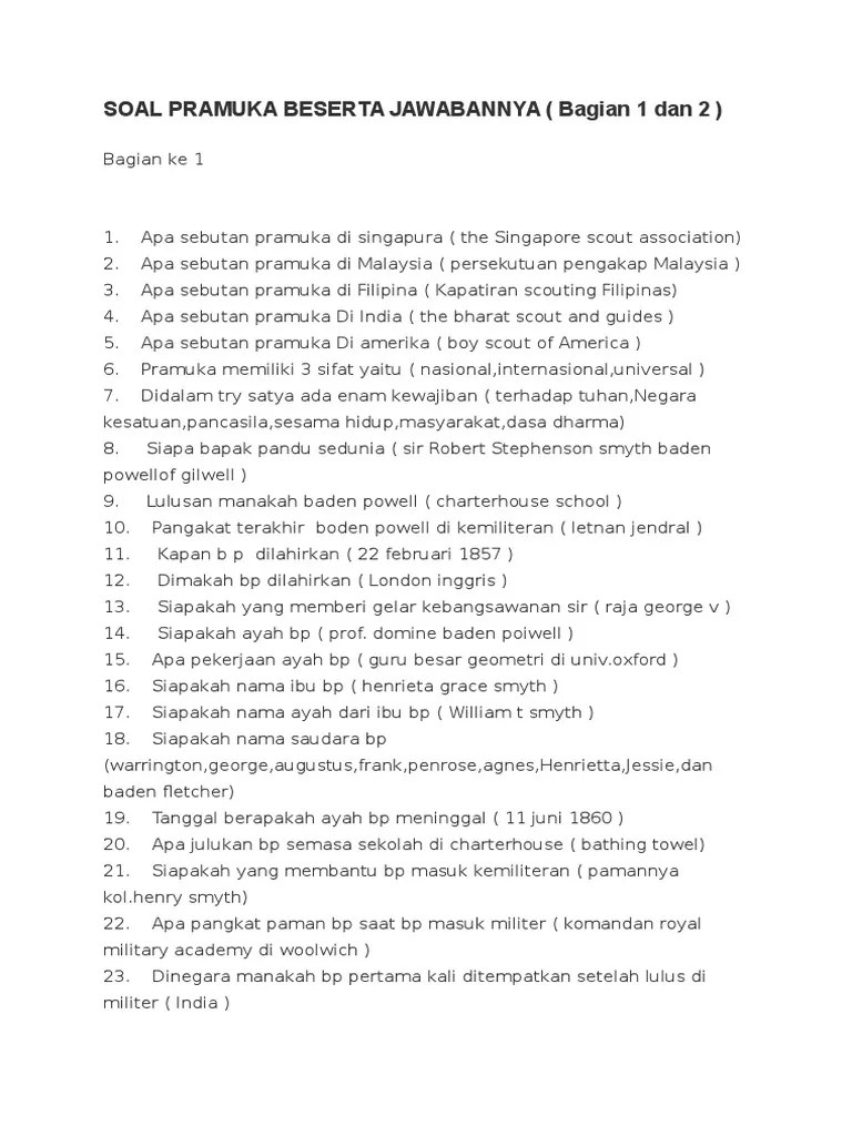 Kumpulan soal pramuka beserta jawabannya ( bagian 1 dan 2 ) bagian ke 1 1. Ada berapa tanda pengenal dalam gerakan pramuka. Pembina gusgus depan smp islam annida ialah. Soal rangking 1 penggalang atau soal olimpiade pramuka beserta kunci jawaban. Gerakan pramuka adalah salah satu badan penyelenggara pendidikan kepanduan .